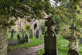 The churchyard where Jack Lewis lies at rest is overgrown, surrounded by trees, and strewn with ancient tilting tombstones marked with moss and lichen.